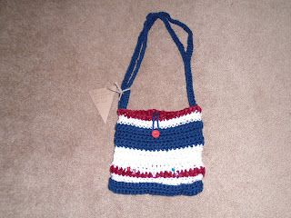 The next one is my first Americana colored purse. "Three Cheers for Red, White and Blue." It is a double interior purse with a red button closure and rhinestone embellishments. Made with a thick yarn, it is two handled and a medium size. Bible verse: Submit to God and be at peace with Him.